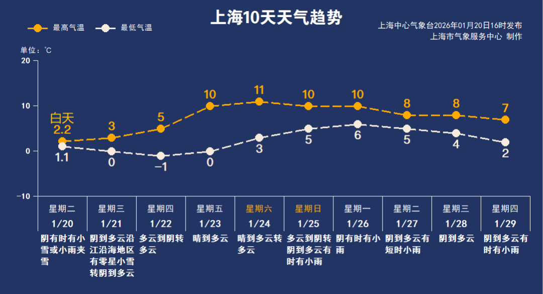本周四起,上海雨雪停止,转为多云为主,但气温再次下探,迎来本周气温低点,市区最低温仅零下1℃。